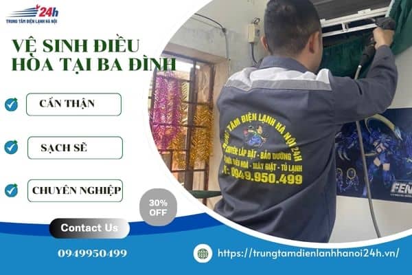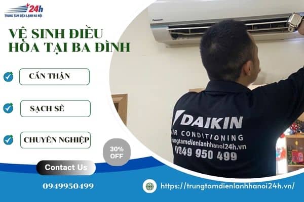 Để tìm được một đơn vị uy tín cung cấp dịch vụ làm sạch điều hòa tại địa bàn quận Ba Đình cũng không phải dễ dàng. Vì hiện nay có quá nhiều cơ sở nhận vệ sinh bảo dưỡng nhưng làm việc vẫn thiếu trách nhiệm, ẩu đả và không cẩn thận. Chính vì vậy, trung tâm điện lạnh Hà Nội 24h của chúng tôi ra đời đặt trụ sở tại 242 Đội Cấn, sẵn sàng phục vụ bạn dù là vệ sinh hay sửa chữa các dịch vụ như : máy giặt, điều hòa, tủ lạnh, bình nóng lạnh…