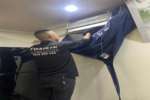 • Bảo vệ không gian: Sử dụng bạt che chắn sàn nhà, tường và bọc túi hứng nước chuyên dụng dưới dàn lạnh để hứng toàn bộ nước thải.