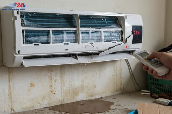 - Nguyên nhân: Tắc đường ống thoát nước, máng hứng nước bị nứt/bẩn, hoặc dàn lạnh bị đóng tuyết (do quá bẩn hoặc thiếu gas).