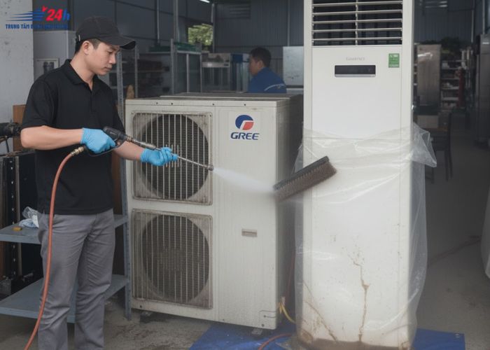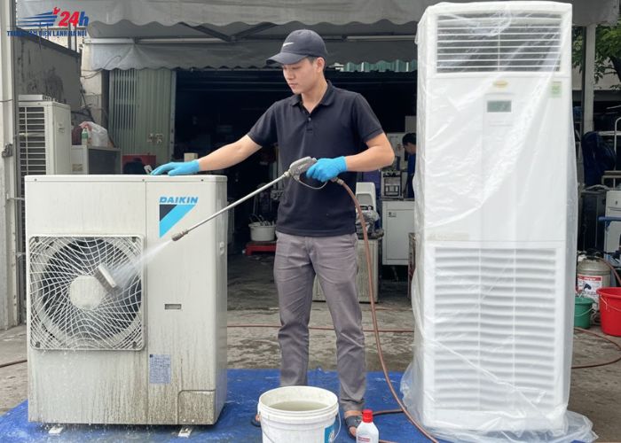 - Vệ sinh điều hòa cây siêu sạch bằng máy rửa áp lực cao + dung dịch diệt khuẩn