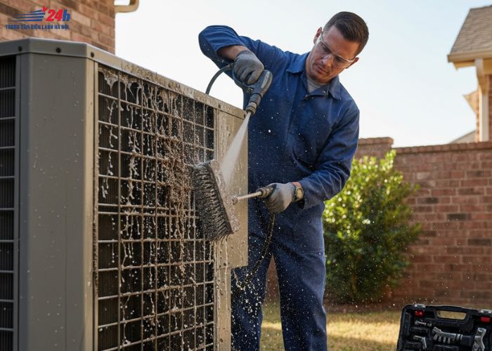 Bước 3: Thực hiện vệ sinh dàn lạnh và cục nóng điều hòa bằng khăn mềm hoặc chổi lông để loại bỏ sạch những bụi bẩn bám trên bề mặt. Nếu có những vết ố khó làm sạch bạn cần dùng những dung dịch vệ sinh chuyên dụng để thực hiện làm sạch máy lạnh nhanh nhất.