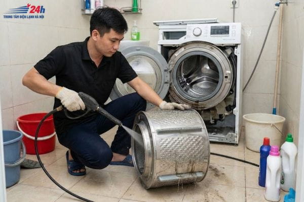 Tháo và làm sạch lồng giặt (Hạng mục quan trọng nhất) Đây là nơi tích tụ 80% vi khuẩn. Kỹ thuật viên sẽ sử dụng thiết bị chuyên dụng để:
